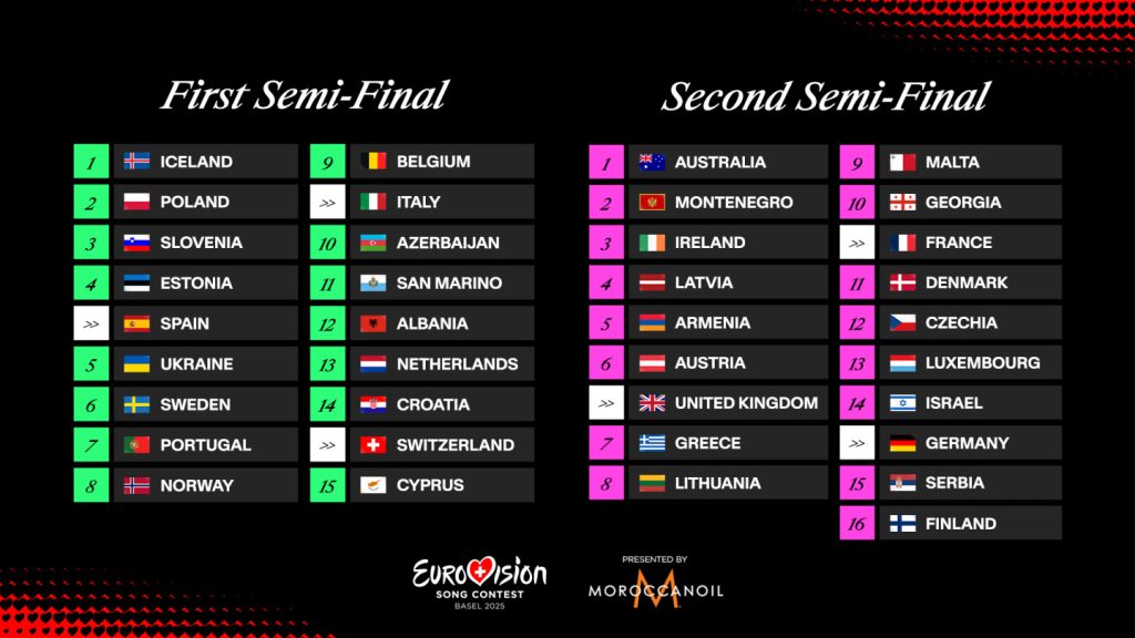 La Unión Europea de Radiodifusión ha dado a conocer a través de su canal de YouTube, el orden de actuación de las las dos semifinales de Eurovisión 2025 que se celebran el 13 y 15 de mayo respectivamente, así como el de los países del Big Five (España, Francia, Alemania, Italia y Reino Unido) y el del anfitrión, Suiza.