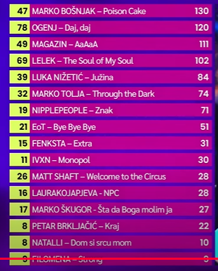 El resultado final fue determinado mediante un sistema de votación que combinó el voto del jurado (50%) y el televoto del público (50%). Ocho jurados contribuyeron a la decisión: cuatro nacionales (Zagreb, Split, Rijeka y Osijek) y cuatro internacionales (Finlandia, Armenia, Eslovenia y España). Cada jurado estuvo compuesto por tres profesionales de la música.