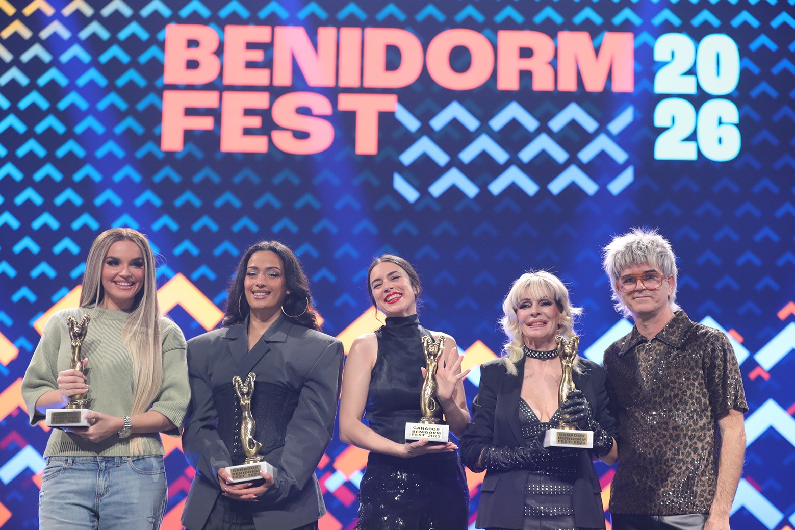 En una evento cargado de simbolismo, la organización del Benidorm Fest decidió que el nuevo trofeo no debía pertenecer únicamente al futuro. Por ello, las ganadoras de las cuatro ediciones previas regresaron al escenario para recibir la estatuilla que no existía en su momento.
