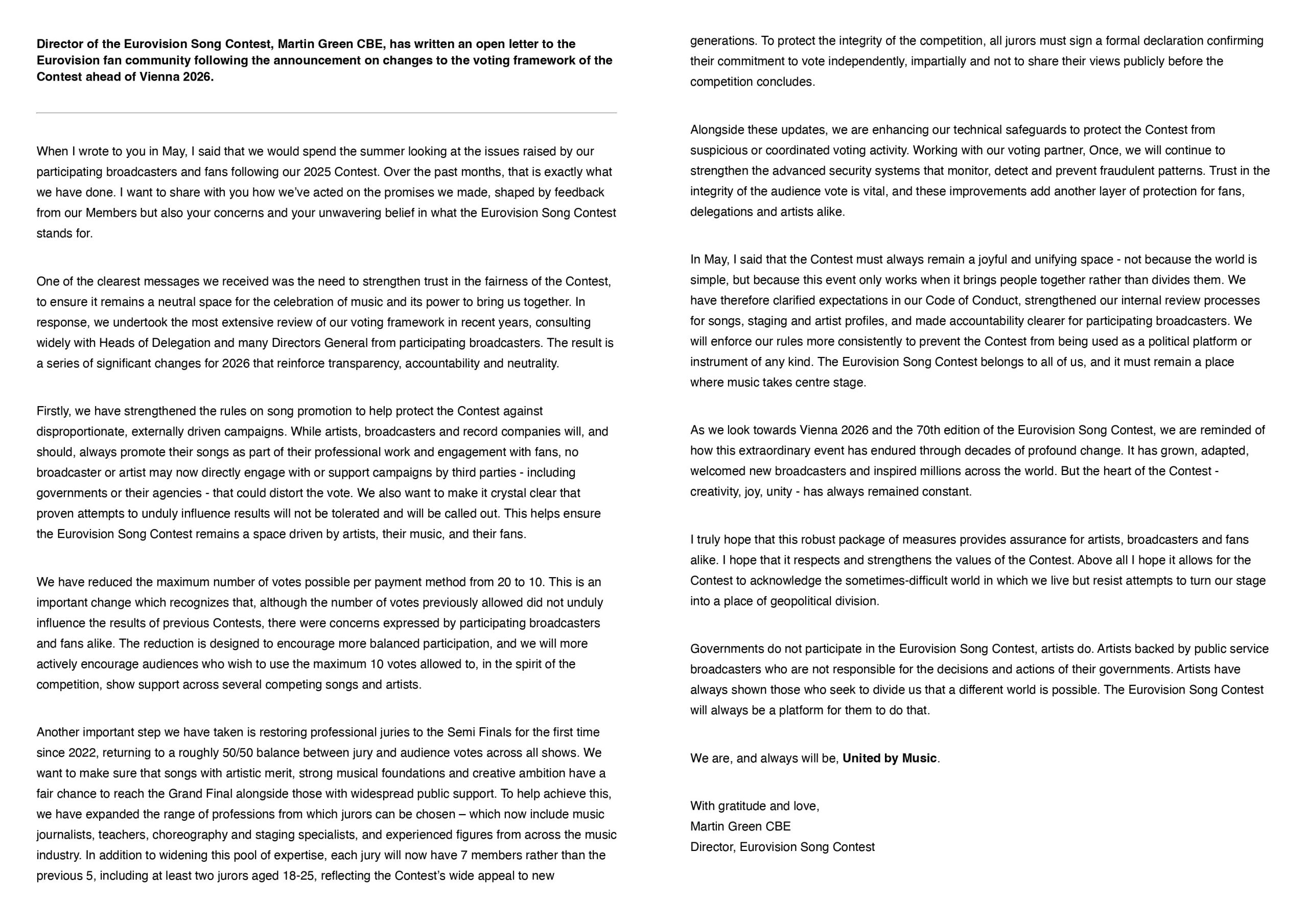 Mediante una carta a la comunidad eurofan, subraya que, aunque la edición de 2025 fue “válida y robusta”, estos cambios son necesarios para proteger el concurso del “uso indebido” y la “instrumentalización” por parte de terceros (como campañas gubernamentales o políticas).