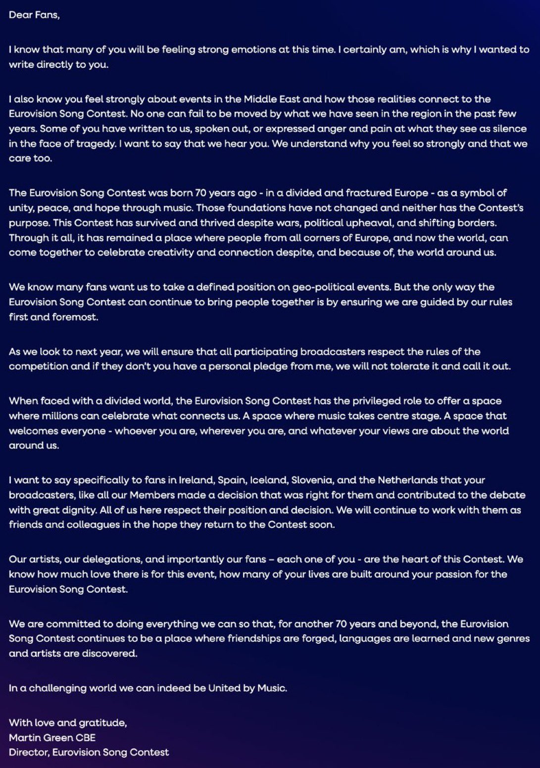 La misiva concluye con un compromiso personal: la organización está dedicada a hacer todo lo posible para que Eurovisión siga siendo un lugar de amistad y descubrimiento de talentos por otros 70 años, recordándonos el lema que nos une: “United by Music” (Unidos por la Música).